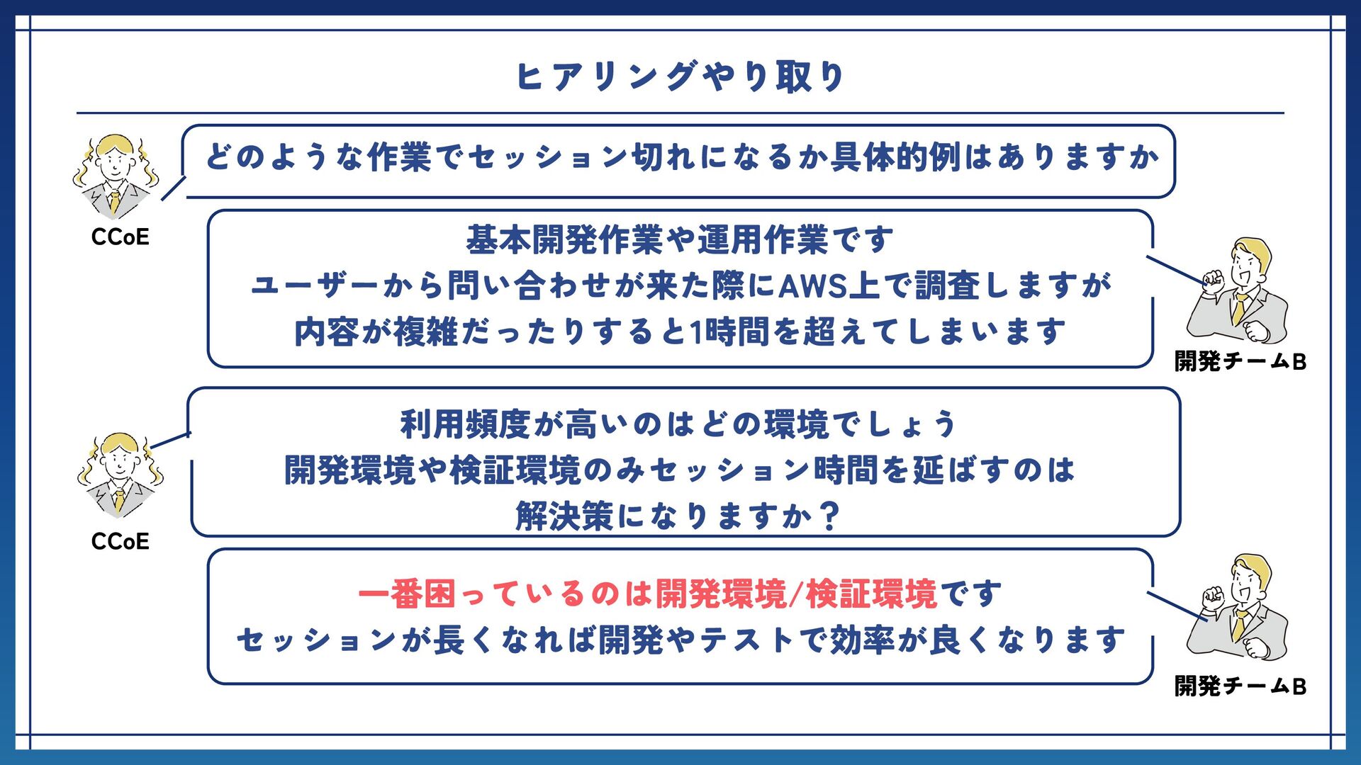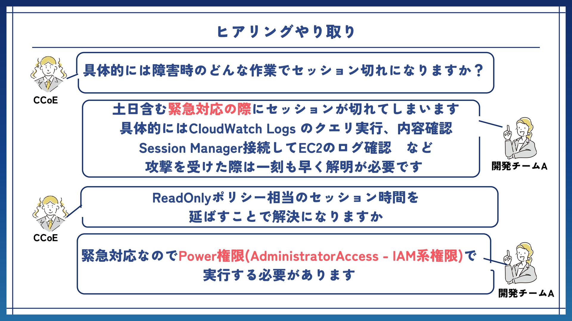 緊急対応なのでPower権限(AdministratorAccess - IAM系権限)で 実行する必要があります ReadOnlyポリシー相当のセッション時間を 延ばすことで解決になりますか ヒアリングやり取り CCoE CCoE 開発チームA 開発チームA