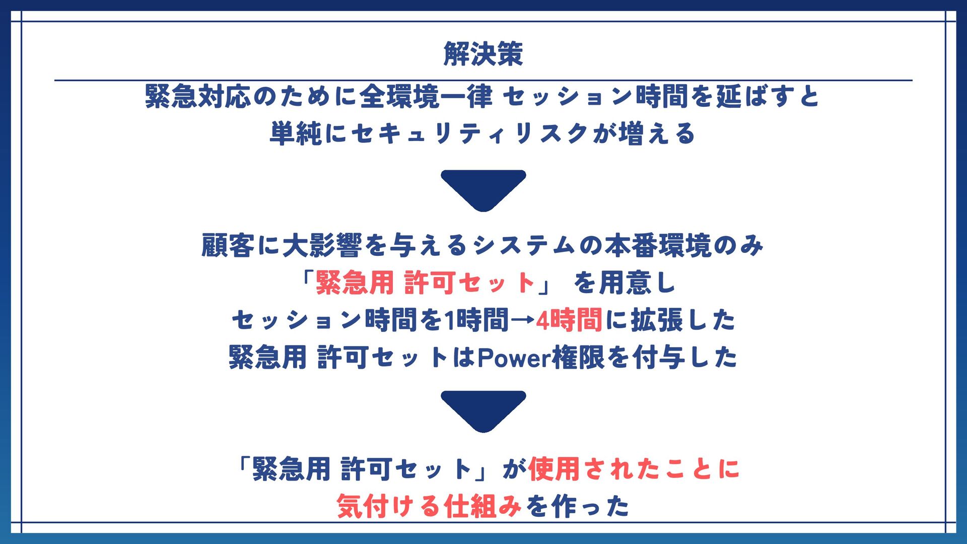 顧客に大影響を与えるシステムの本番環境のみ 「緊急用 許可セット」 を用意し セッション時間を1時間→4時間に拡張した 緊急用 許可セットはPower権限を付与した 「緊急用 許可セット」が使用されたことに 気付ける仕組みを作った 解決策
