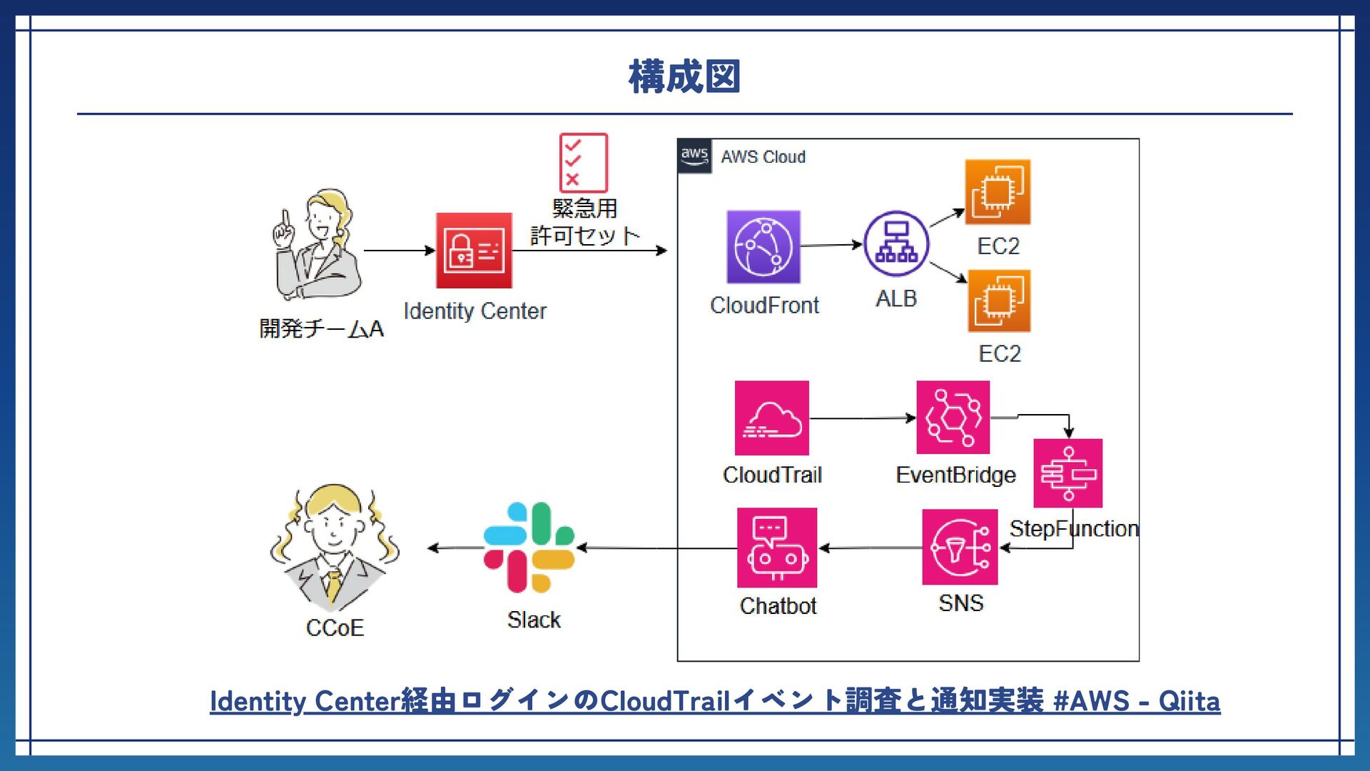 VPCフローログの分析 - セキュリティインシデントの解決 - S3からのログファイルのダウ 構成図 Identity Center経由ログインのCloudTrailイベント調査と通知実装 #AWS -