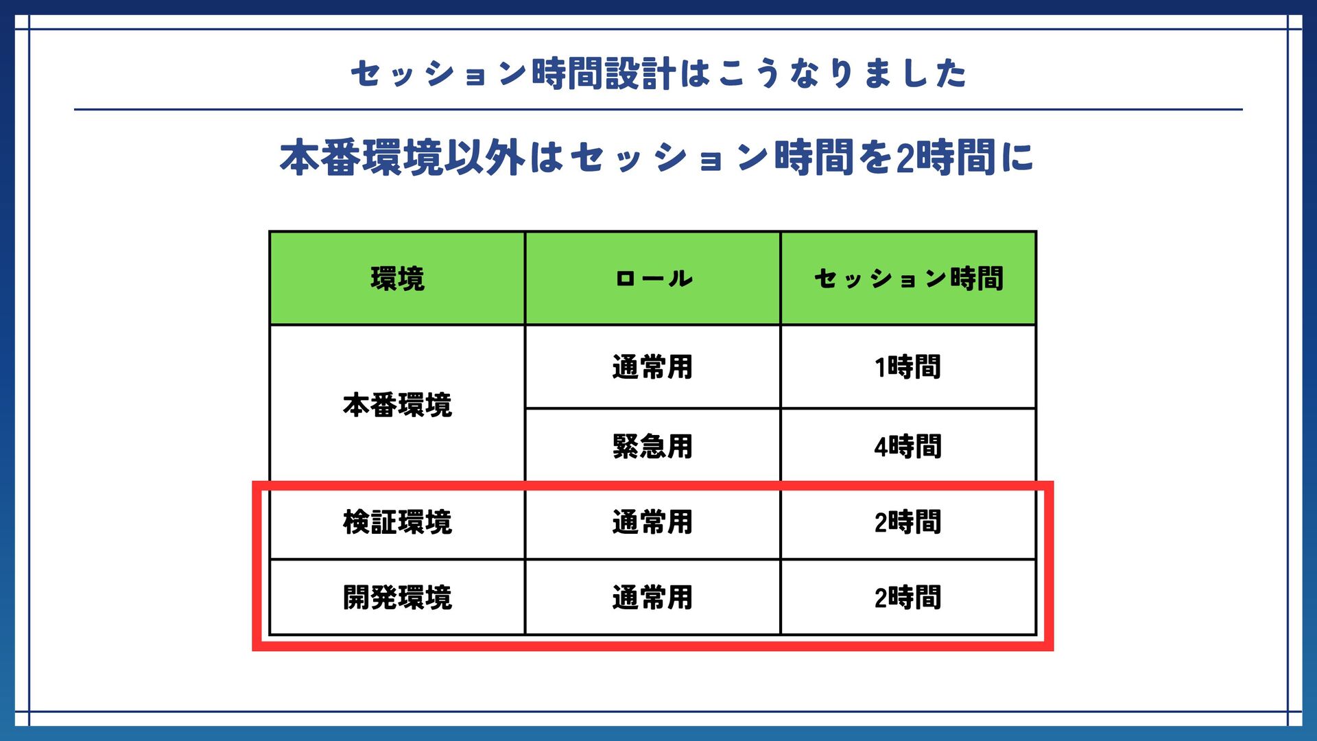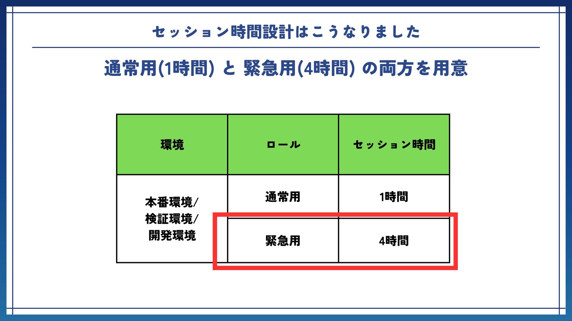 ロール セッション時間 本番環境 通常用 1時間 緊急用 4時間 検証環境 通常用 2時間 開発環境 通常用 2時間
