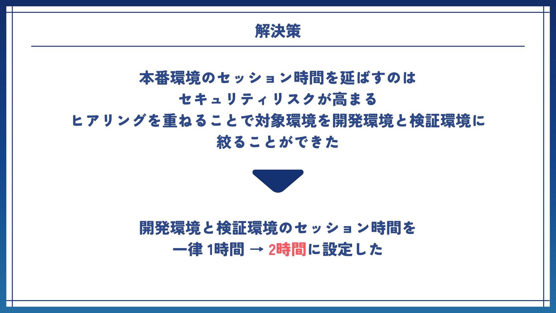 絞ることができた 開発環境と検証環境のセッション時間を 一律 1時間 → 2時間に設定した 解決策