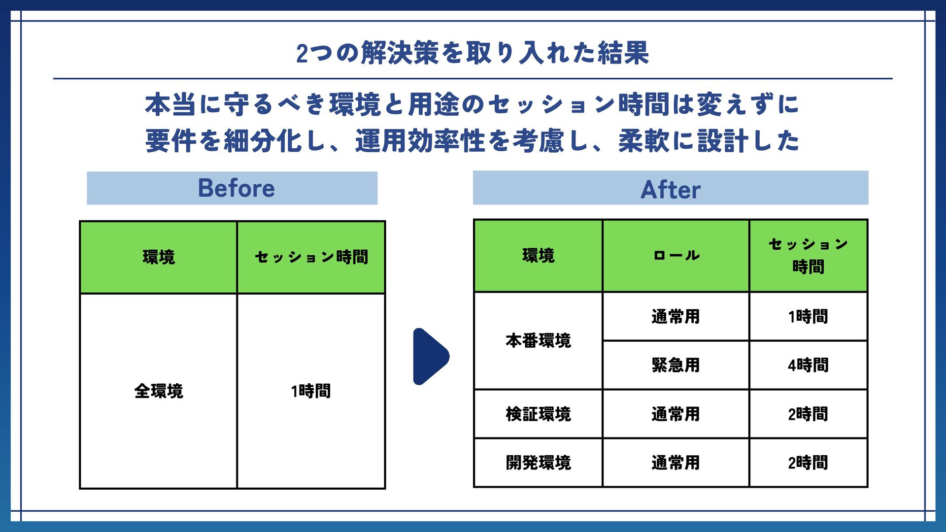 環境 ロール セッション 時間 本番環境 通常用 1時間 緊急用 4時間 検証環境 通常用 2時間 開発環境 通常用 2時間 環境 セッション時間 全環境 1時間 本当に守るべき環境と用途のセッション時間は変えずに 要件を細分化し、運用効率性を考慮し、柔軟に設計した