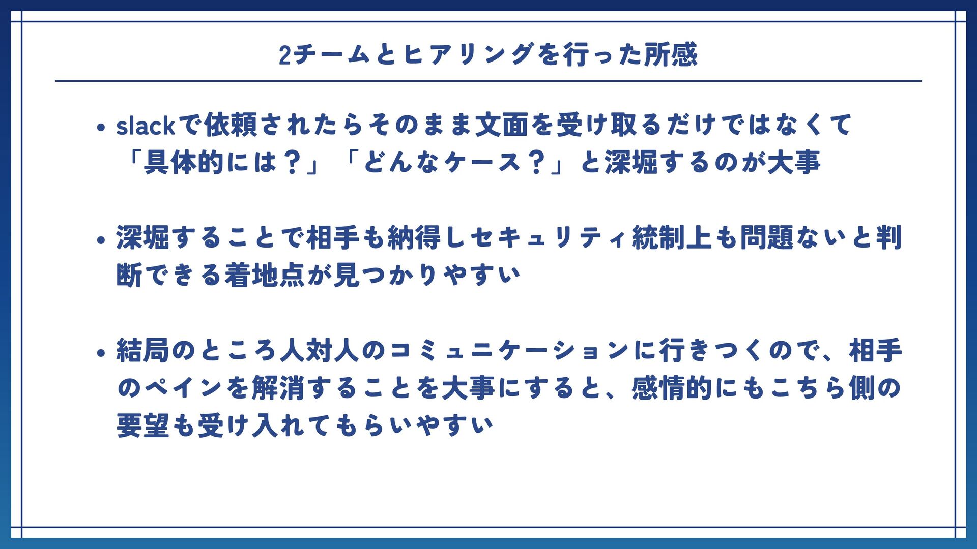 深堀することで相手も納得しセキュリティ統制上も問題ないと判 断できる着地点が見つかりやすい 結局のところ人対人のコミュニケーションに行きつくので、相手 のペインを解消することを大事にすると、感情的にもこちら側の 要望も受け入れてもらいやすい