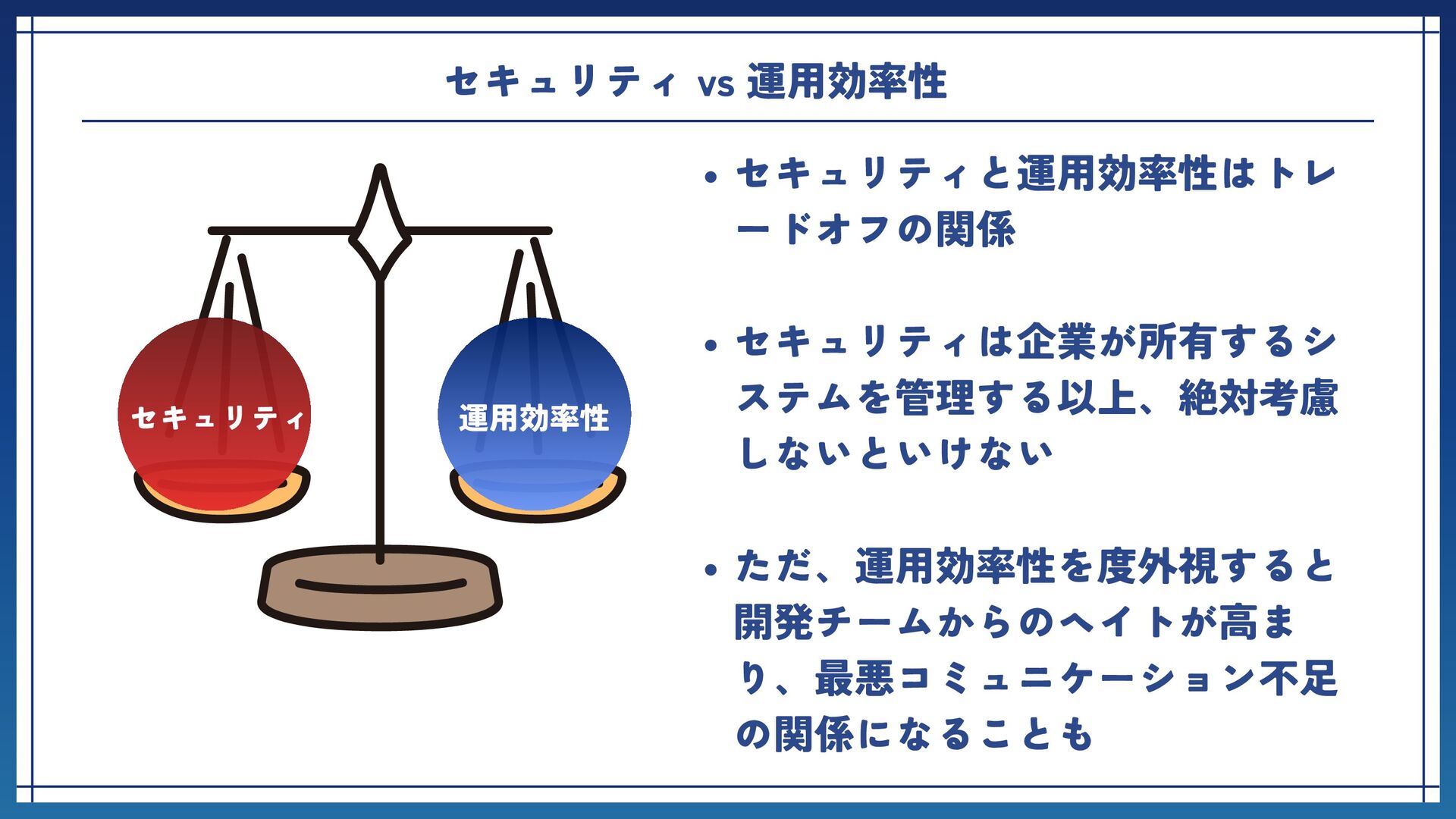 セキュリティ vs 運用効率性 セキュリティ 運用効率性 セキュリティと運用効率性はトレ ードオフの関係 セキュリティは企業が所有するシ ステムを管理する以上、絶対考慮 しないといけない