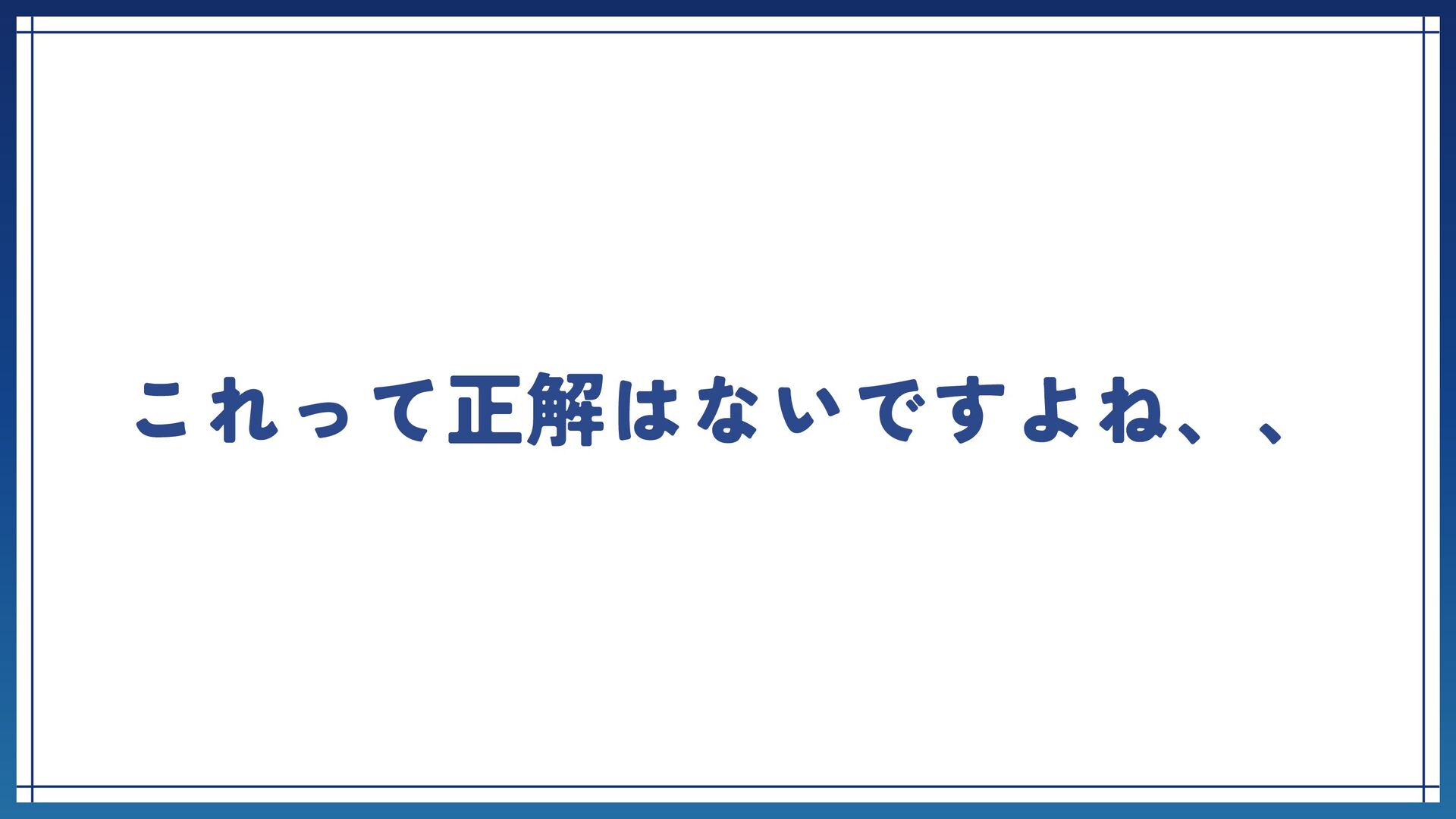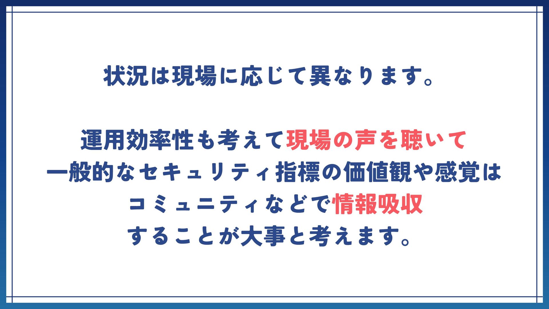 状況は現場に応じて異なります。 運用効率性も考えて現場の声を聴いて 一般的なセキュリティ指標の価値観や感覚は コミュニティなどで情報吸収 することが大事と考えます。