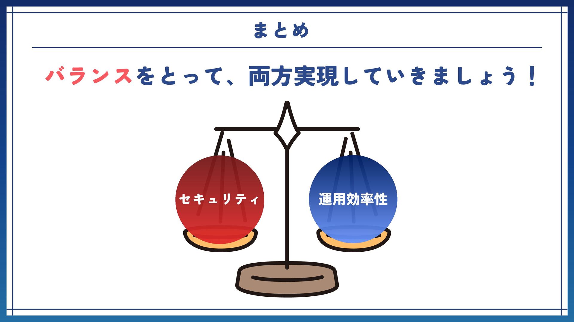 まとめ セキュリティ 運用効率性 バランスをとって、両方実現していきましょう!