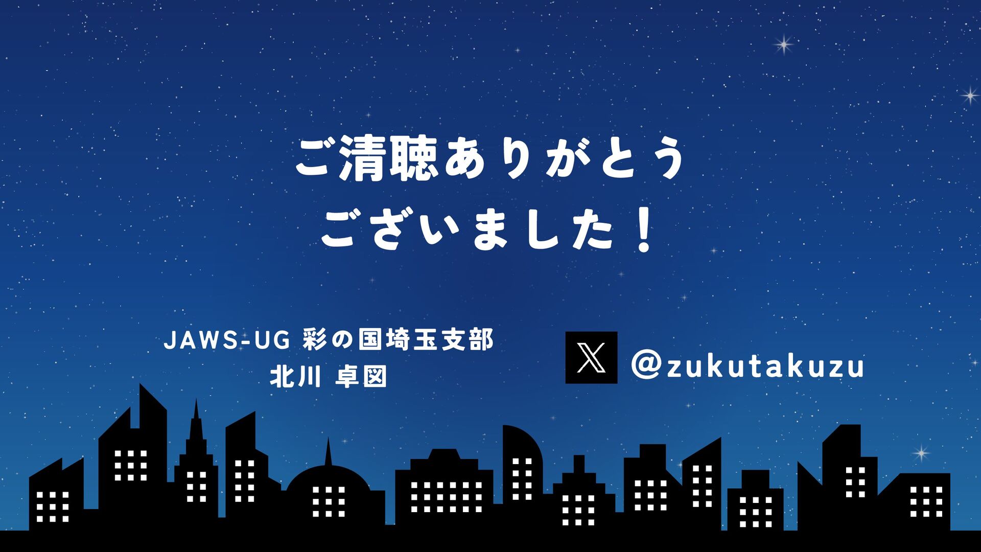 ご清聴ありがとう ございました! JAWS-UG 彩の国埼玉支部 北川 卓図 @zukutakuzu