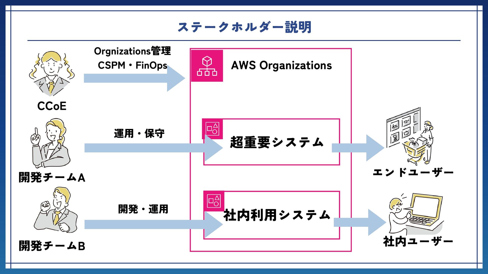 ステークホルダー説明 AWS Organizations 超重要システム 社内利用システム CCoE 開発チームA 開発チームB エンドユーザー 社内ユーザー