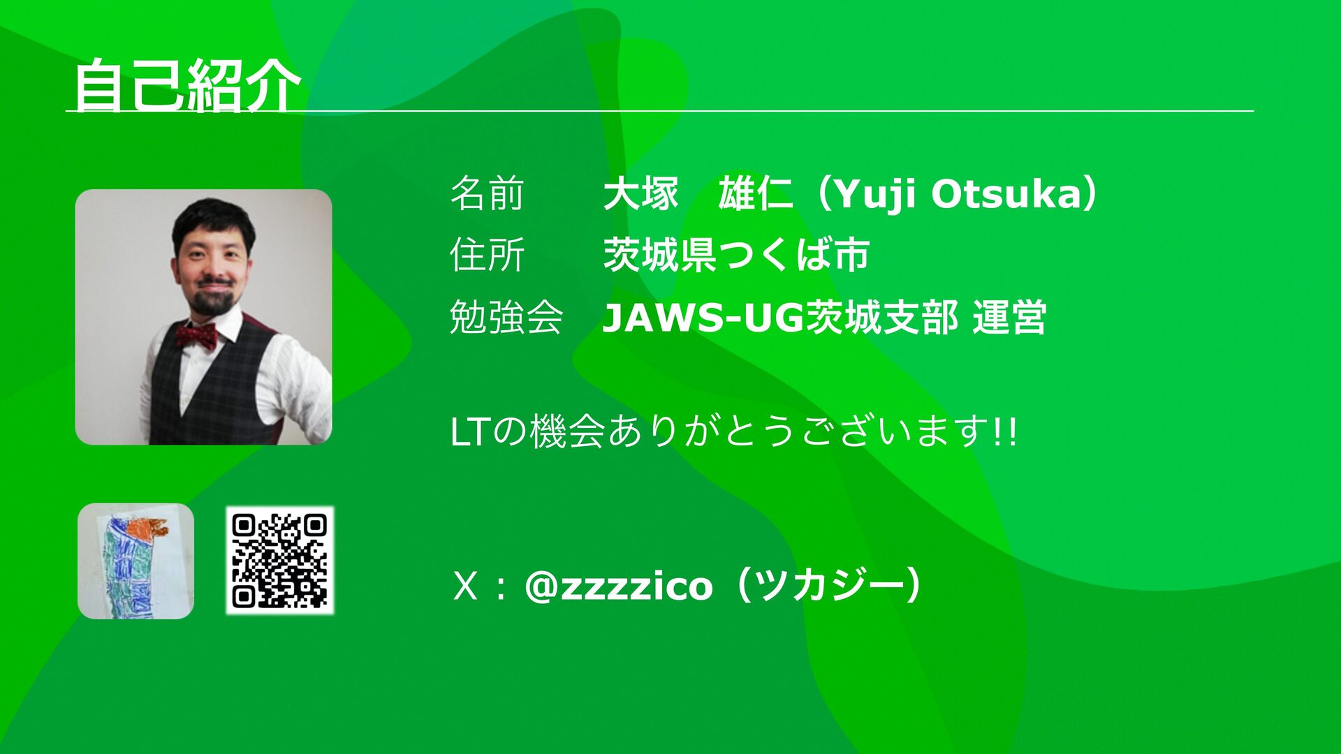ࣗݾհ ໊લɹɹେ௩ɹ༤ਔʢYuji Otsukaʣ ॅॴɹɹἚݝͭ͘ࢢ ษڧձɹJAWS-UGἚࢧ෦ ӡӦ LTͷػձ͋Γ͕ͱ͏͍͟͝·͢!! X : @zzzzicoʢπΧδʔʣ