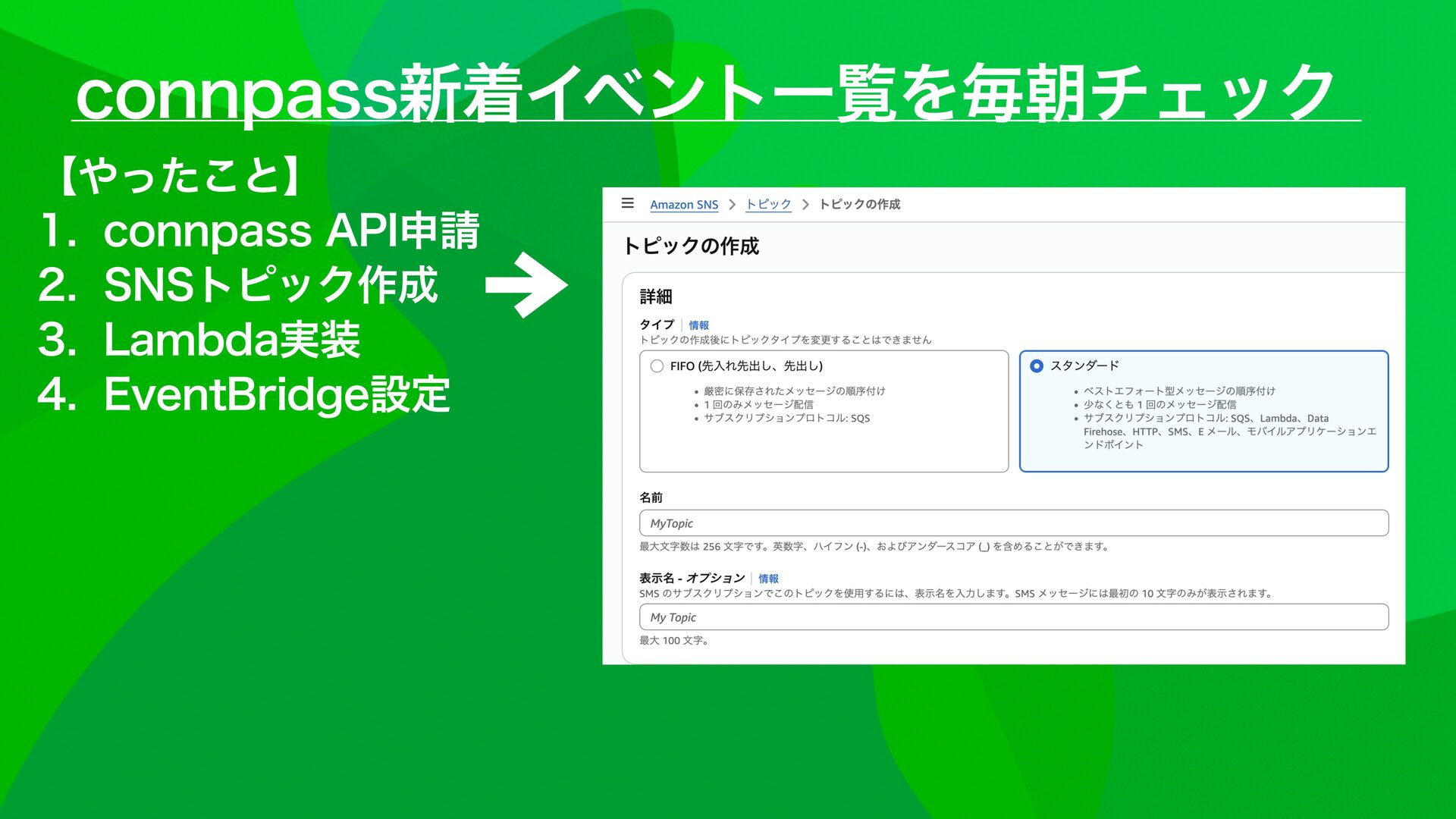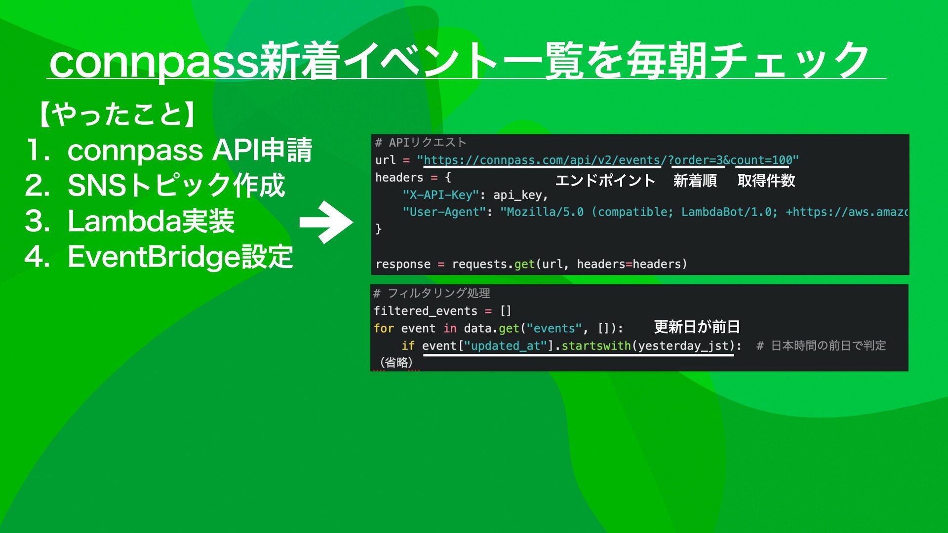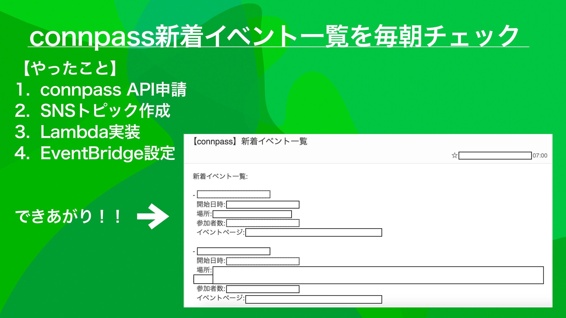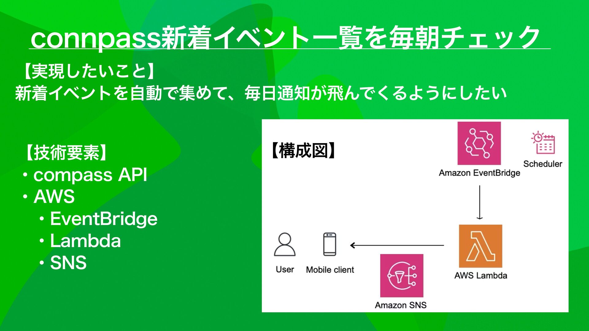 DPOOQBTT৽ணΠϕϯτҰཡΛຖேνΣοΫ ʲ࣮ݱ͍ͨ͜͠ͱʳ ৽ணΠϕϯτΛࣗಈͰूΊͯɺຖ௨͕ඈΜͰ͘ΔΑ͏ʹ͍ͨ͠ ʲٕज़ཁૉʳ ɾDPNQBTT"1* ɾ"84 ɹɾ&WFOU#SJEHF ɹɾ-BNCEB ɹɾ4/4 ʲߏਤʳ