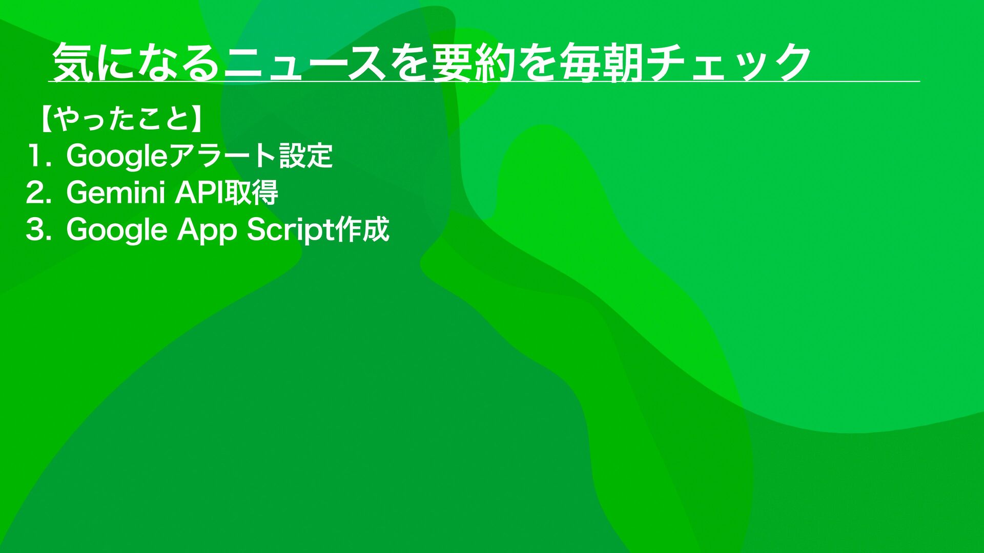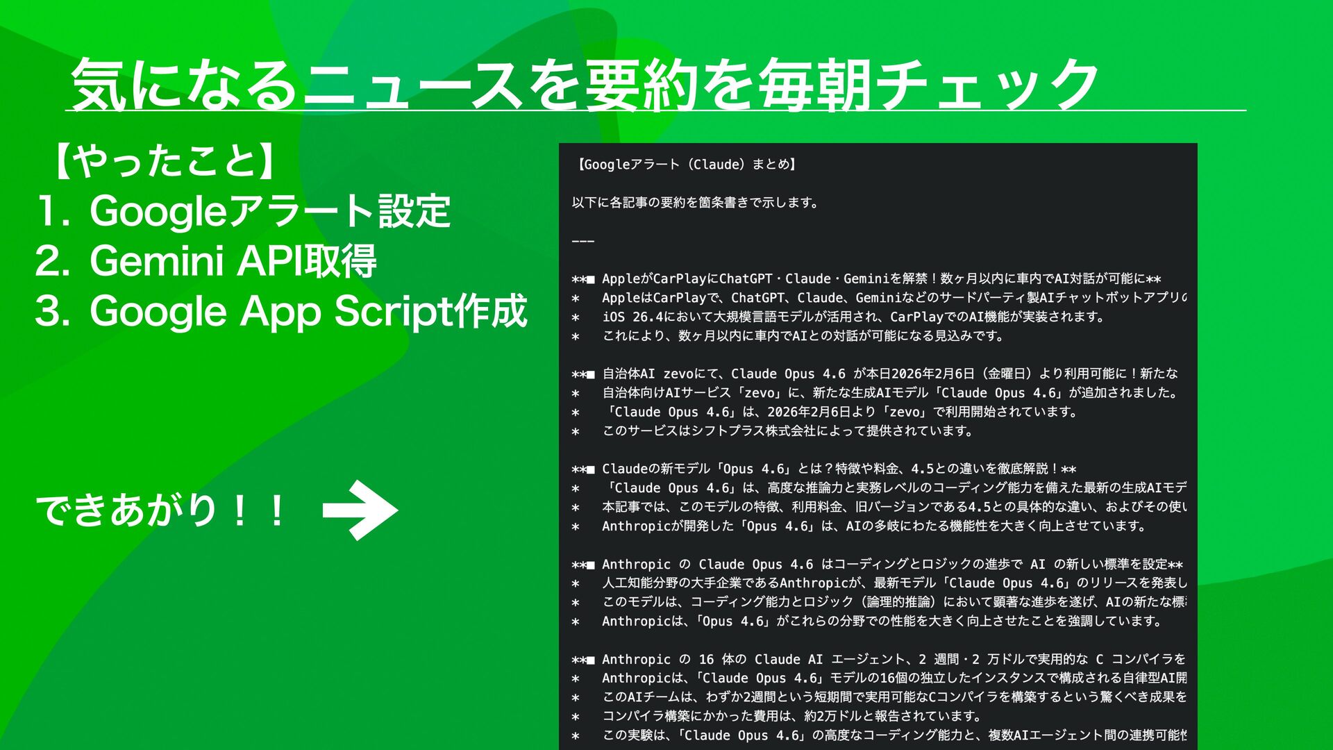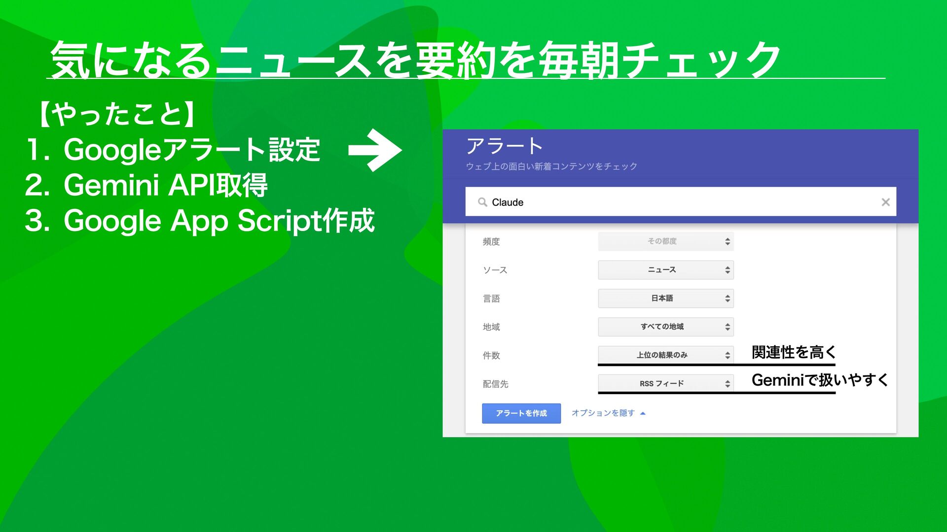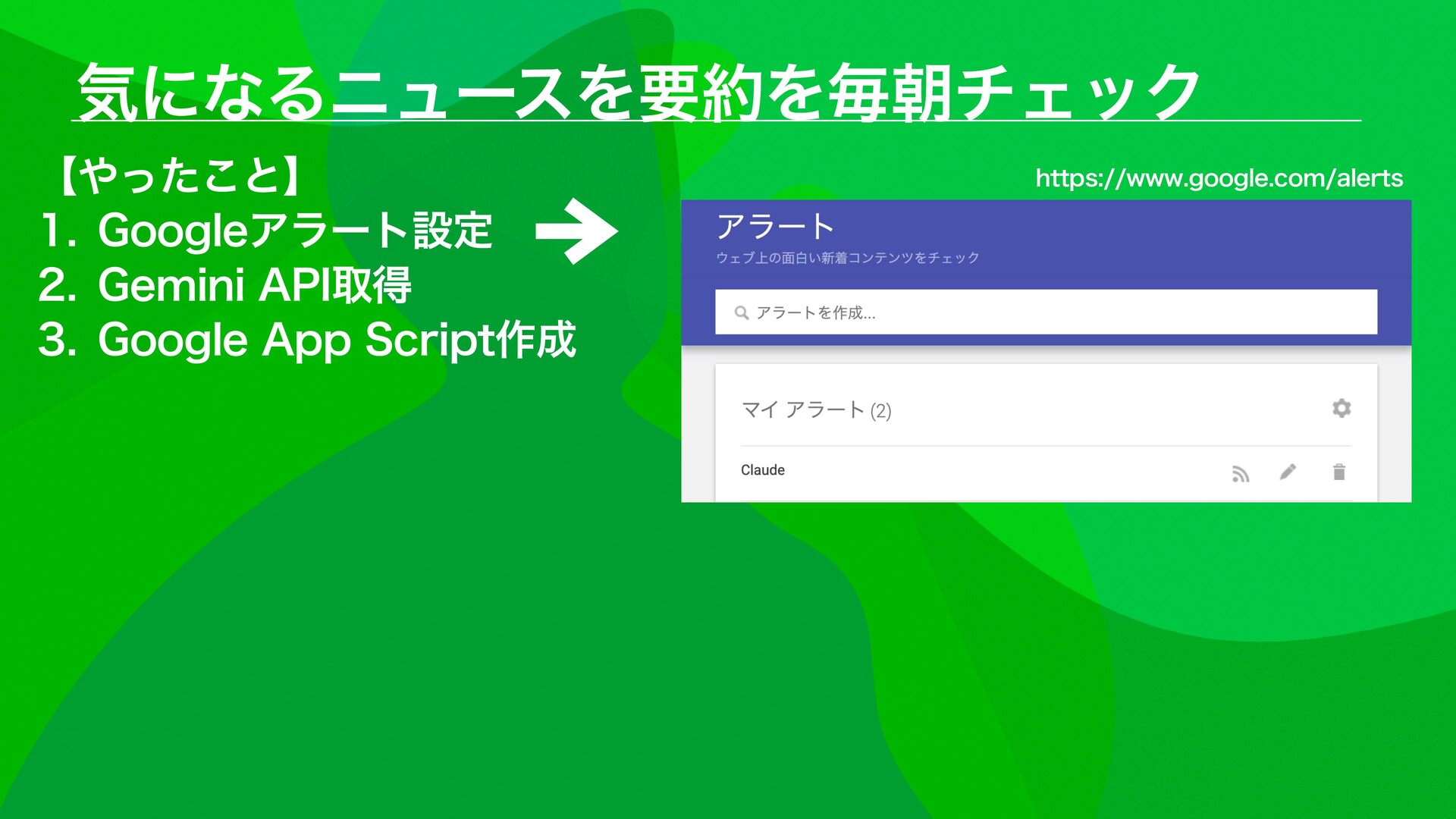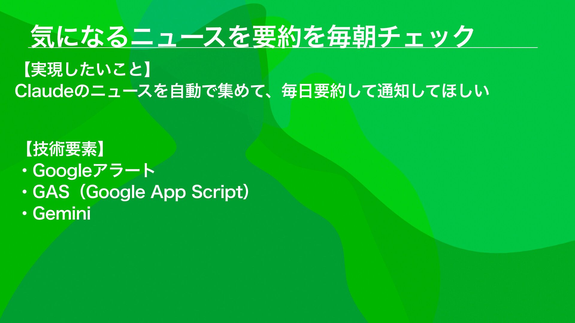 ؾʹͳΔχϡʔεΛཁΛຖேνΣοΫ ʲ࣮ݱ͍ͨ͜͠ͱʳ $MBVEFͷχϡʔεΛࣗಈͰूΊͯɺຖཁͯ͠௨ͯ͠΄͍͠ ʲٕज़ཁૉʳ ɾ(PPHMFΞϥʔτ ɾ("4ʢ(PPHMF"QQ4DSJQUʣ ɾ(FNJOJ