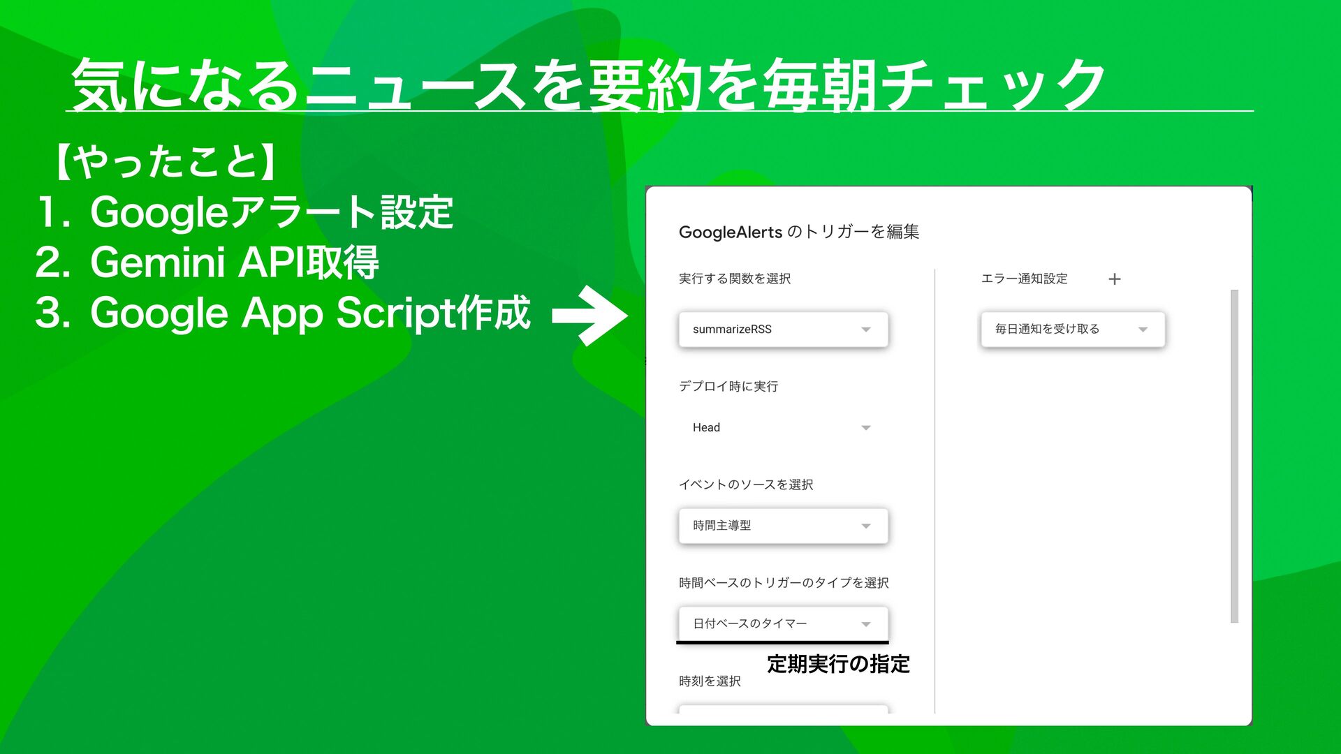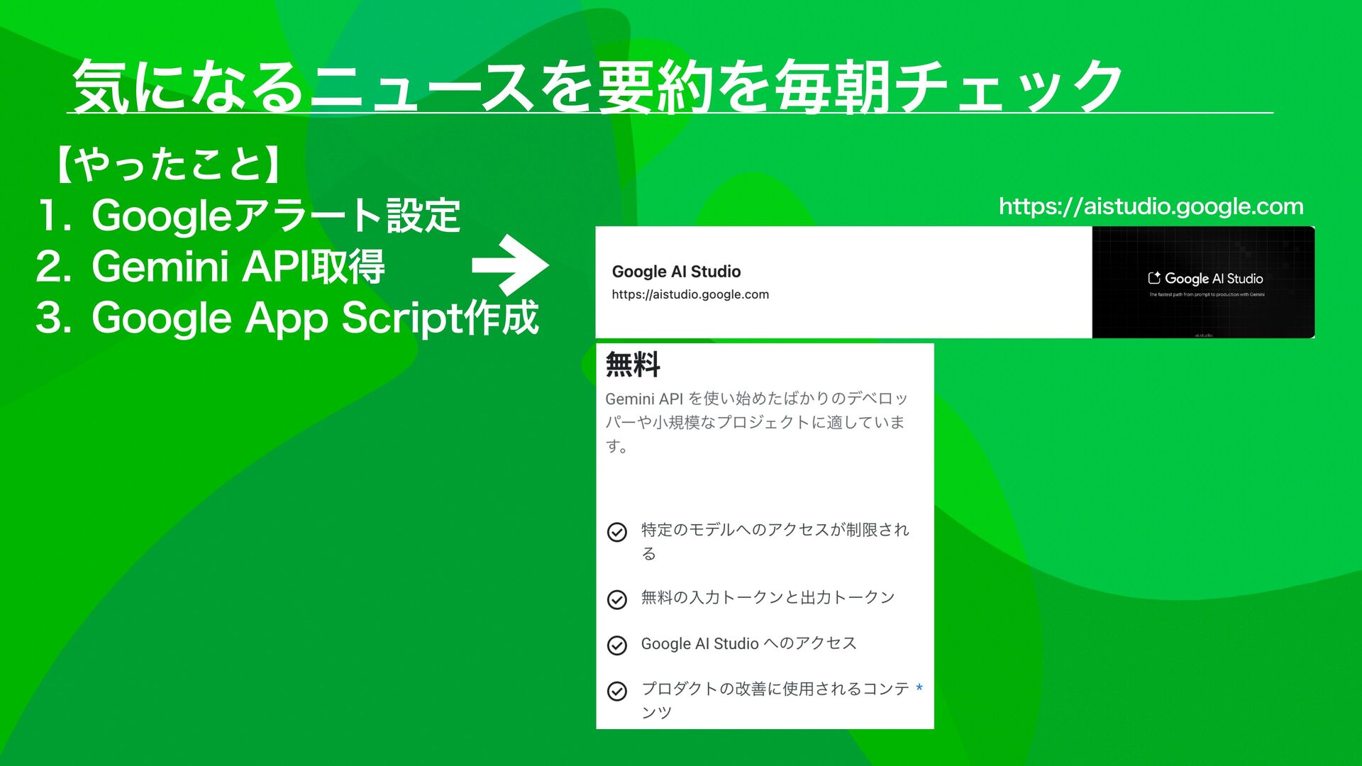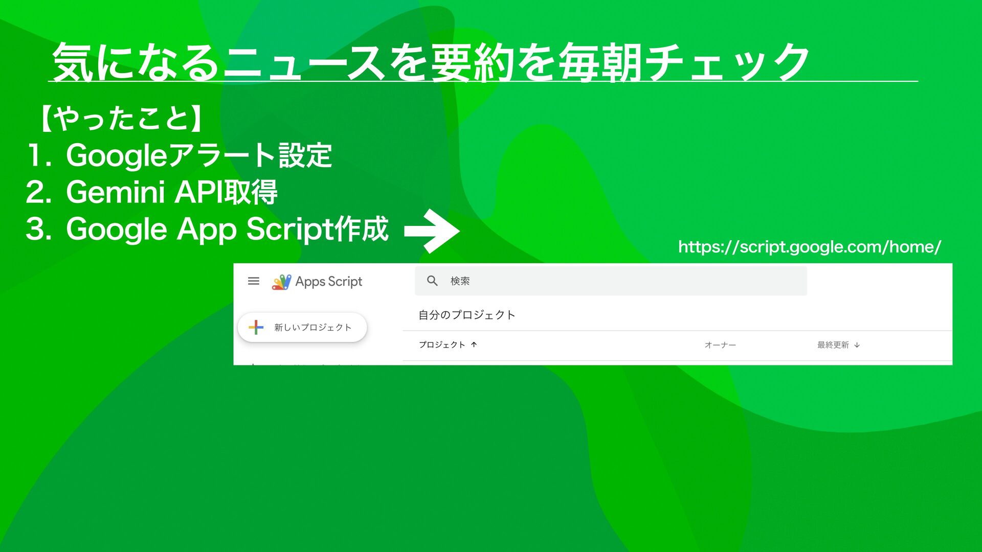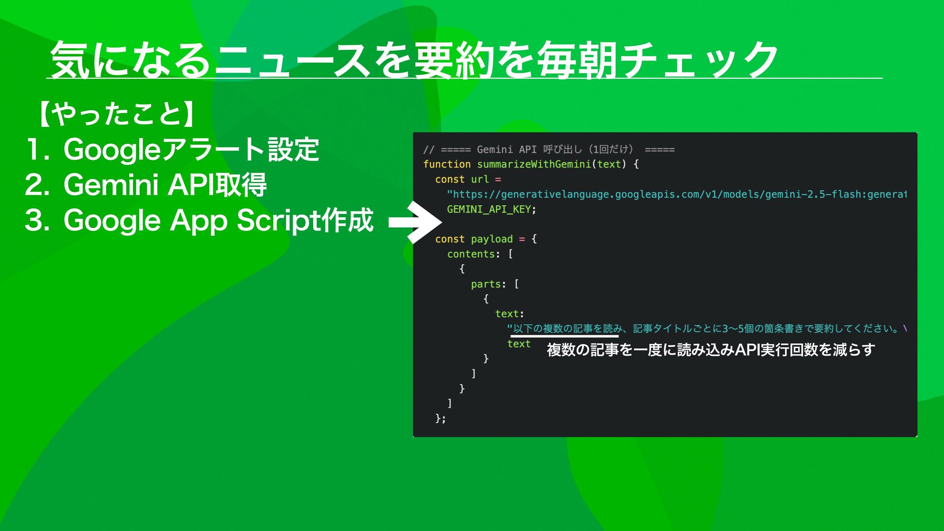 ؾʹͳΔχϡʔεΛཁΛຖேνΣοΫ ʲͬͨ͜ͱʳ (PPHMFΞϥʔτઃఆ (FNJOJ"1*औಘ (PPHMF"QQ4DSJQU࡞ ෳͷهࣄΛҰʹಡΈࠐΈ"1*࣮ߦճΛݮΒ͢