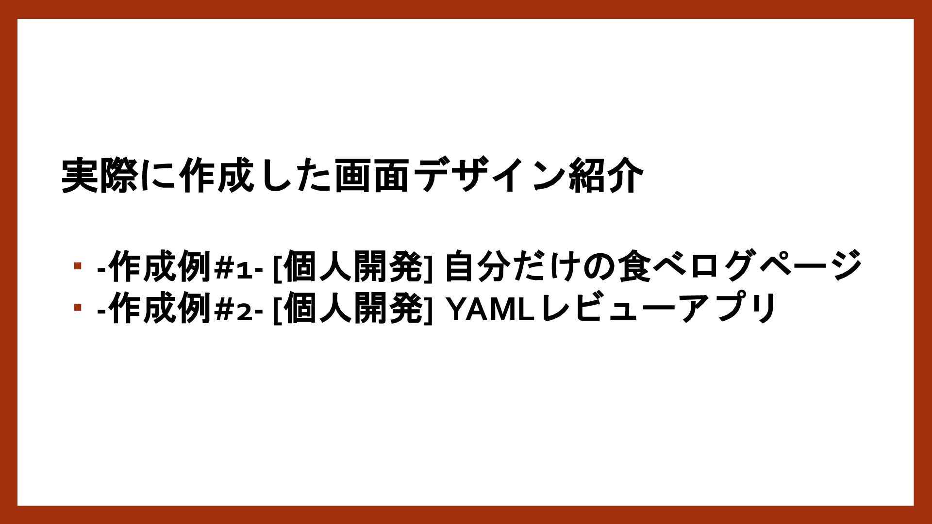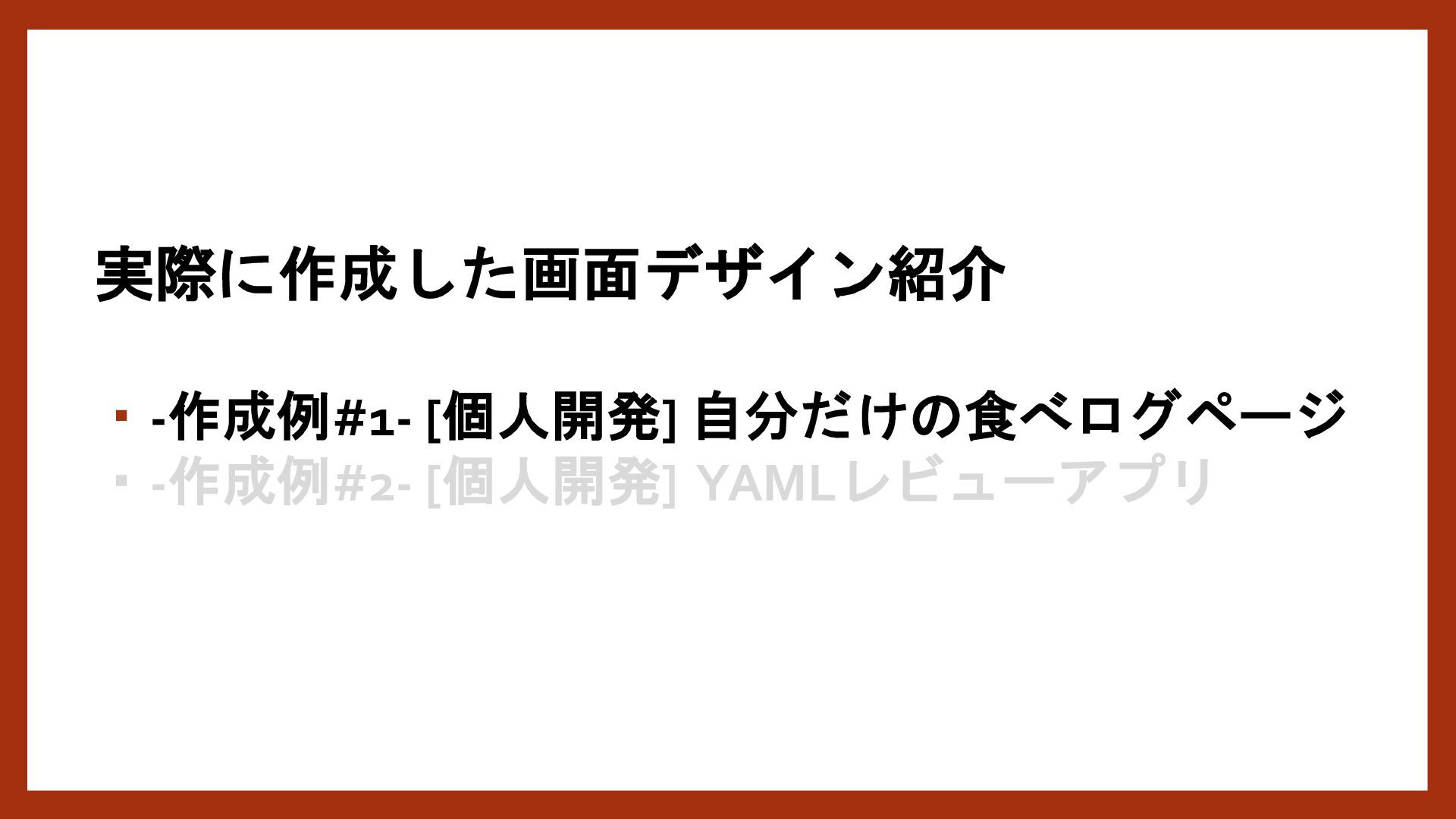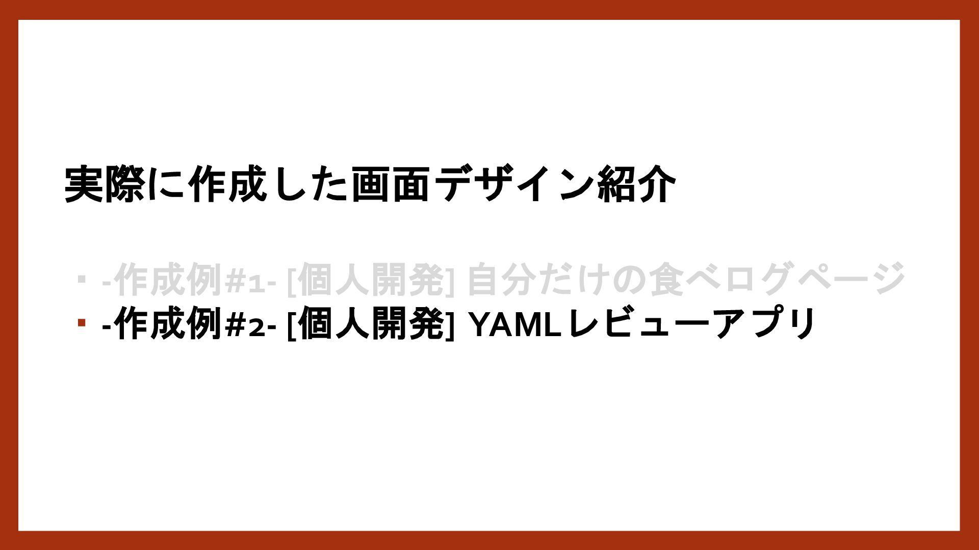 実際に作成した画面デザイン紹介 ・-作成例#1- [個人開発] 自分だけの食べログページ ・-作成例#2- [個人開発] YAMLレビューアプリ