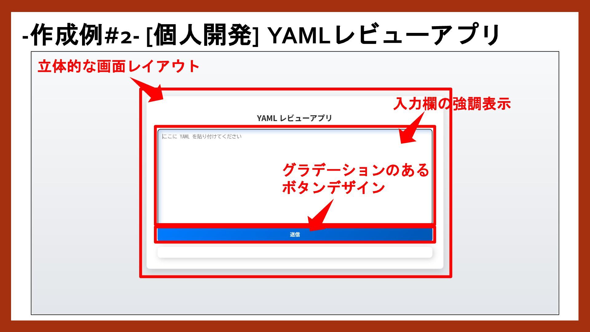 -作成例#2- [個人開発] YAMLレビューアプリ 立体的な画面レイアウト グラデーションのある ボタンデザイン 入力欄の強調表示