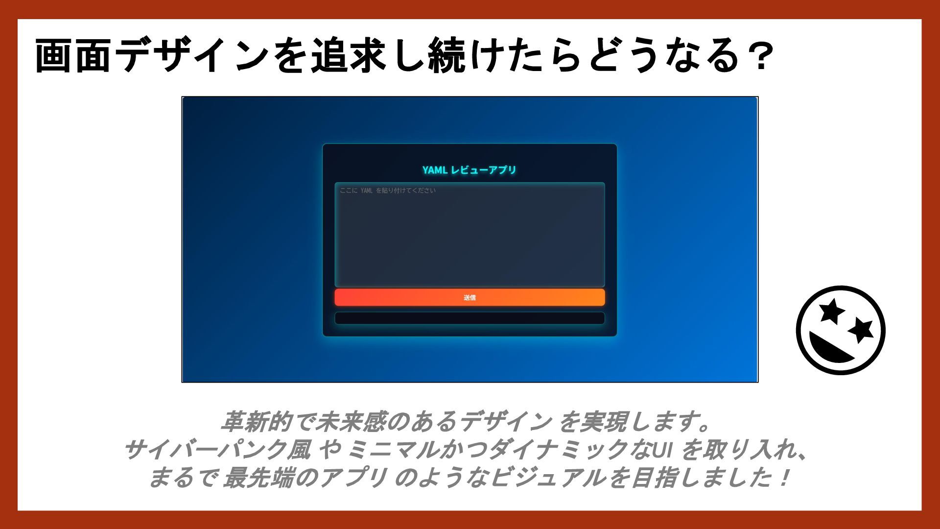 画面デザインを追求し続けたらどうなる? 革新的で未来感のあるデザイン を実現します。 サイバーパンク風 や ミニマルかつダイナミックなUI を取り入れ、 まるで 最先端のアプリ のようなビジュアルを目指しました!