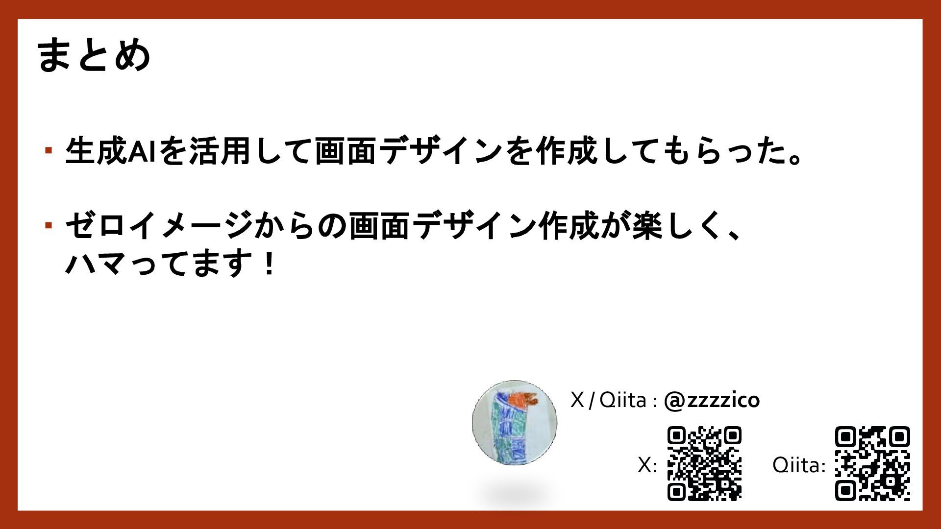 ・生成AIを活用して画面デザインを作成してもらった。 ・ゼロイメージからの画面デザイン作成が楽しく、 ハマってます! まとめ X / Qiita : @zzzzico X: