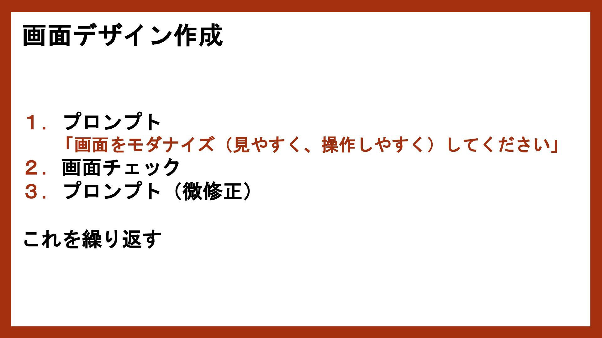 1.プロンプト 「画面をモダナイズ(見やすく、操作しやすく)してください」 2.画面チェック 3.プロンプト(微修正) これを繰り返す 画面デザイン作成