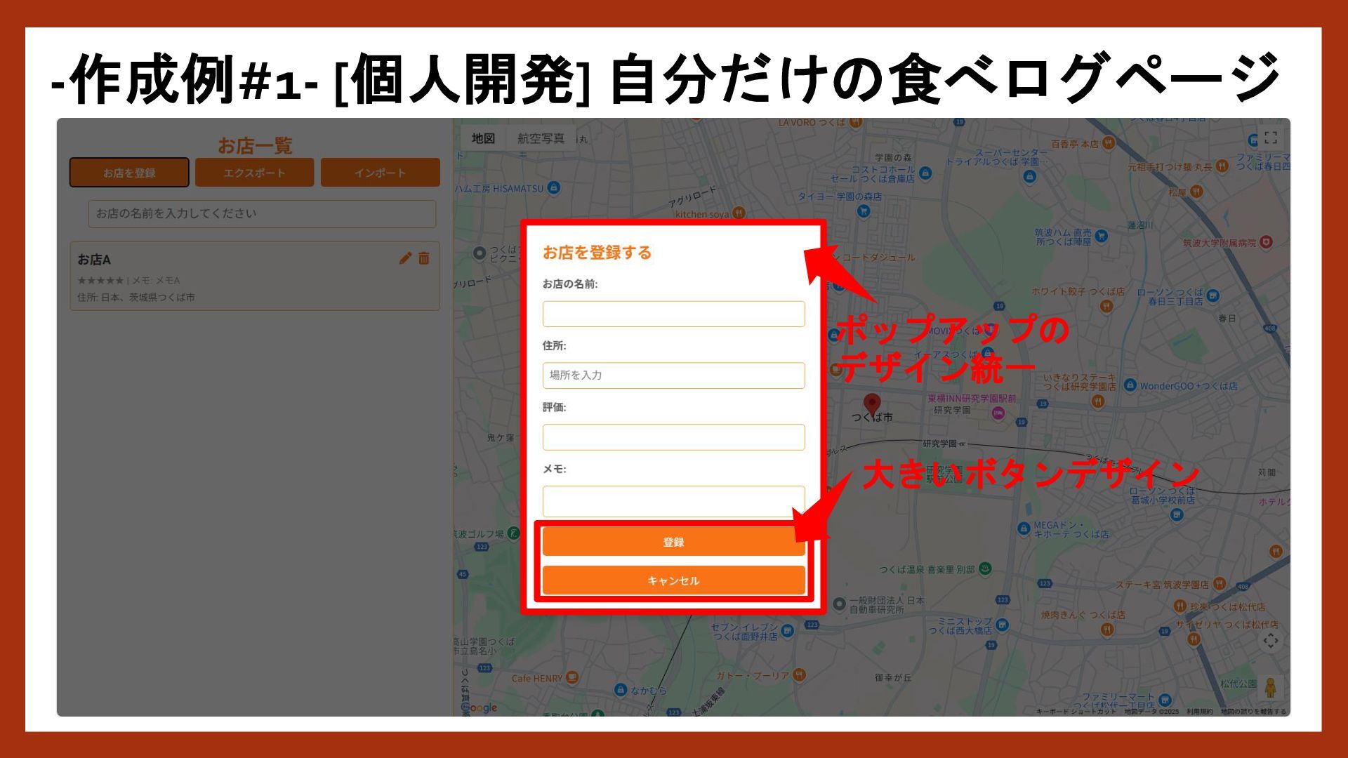 -作成例#1- [個人開発] 自分だけの食べログページ ポップアップの デザイン統一 大きいボタンデザイン
